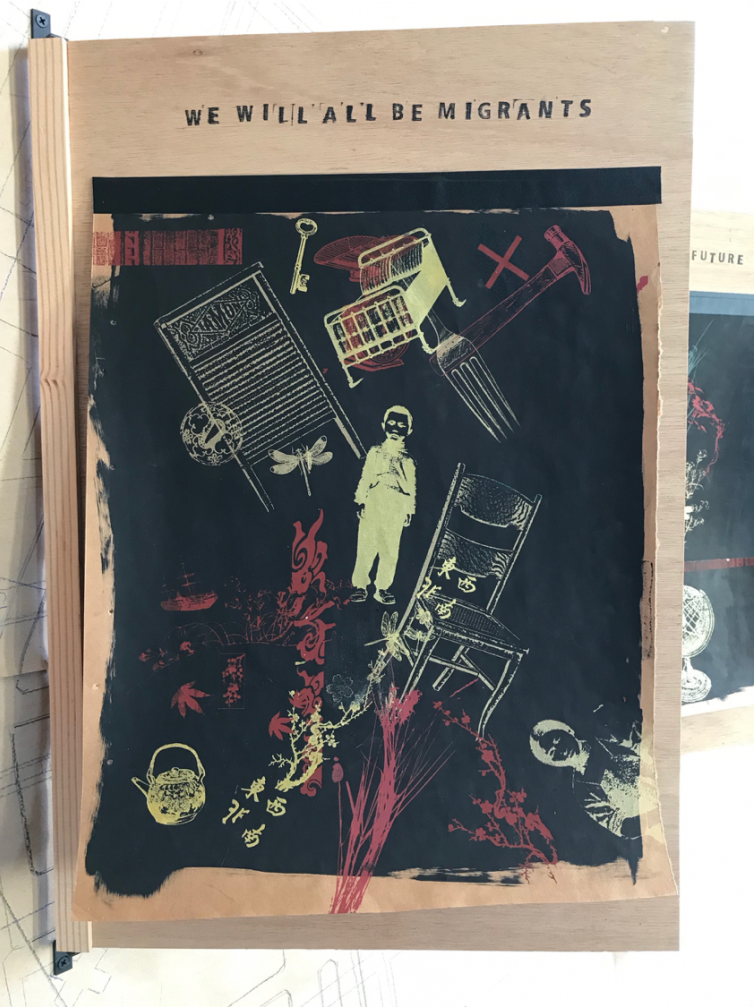 Tomie showed photos of work produced in these communal spaces and collective groups, and shared a personal statement about her family's history that gives context to the recurring themes of immigration and displacement in her work: