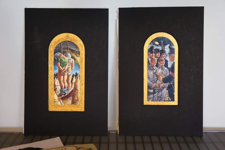 Here at the Joan Mitchell Center, I've been trying to find a balance between being in the studio, trying to get some work done, and also wanting to be out and about in New Orleans, documenting things or hanging out with friends and reconnecting. Before Katrina, I had started a series of paintings of my versions of the Stations of the Cross, and they were all going to be set in the French Quarter. Everybody in them was going to be people that I knew from the French Quarter, characters that I’ve known for years, friends, settings, events. The first time Charles and I came to New Orleans, we were sitting in the window of Pat O’Brien’s, and this young man was coming down Bourbon Street wearing a loincloth and a bandanna, a big peace medallion, and he was carrying a heavy cross over his shoulder. I named him in my head, “Well, that’s Hippie Jesus,” and that’s been a character that has occurred throughout my work ever since. I thought, “Hippie Jesus, that’d be a great idea to use for the Stations of the Cross.” They’ll be bawdy, a little naughty, you know, as it should be, but also trying to be true to the source material.