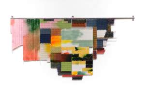 My latest body of work involves the use of conveyor belts that I transform by painting and reconfiguring their various components. The end results, like tapestries, have an almost woven effect. I often think of bright, acidic color when I paint these plastic surfaces due to their strong artificial quality; it is my interest to heighten the mass manufactured characteristics of these materials and ultimately spin them into something artistic and beautiful.”