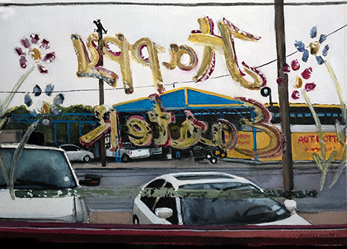 Though I paint urban landscapes in the realist tradition, my interests are not simply formal: my paintings attempt to capture the cultural, psychological and spiritual realms of these singular sights that surround me. In this light, a car or pickup truck can represent aspirations of physical and social mobility, while a neon mannequin bride casts a long (painted) shadow as the feminine protagonist in a silent film that unfolds through my windshield."”