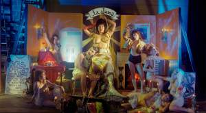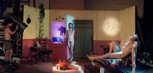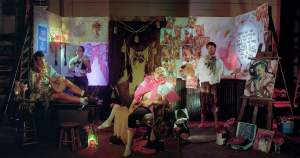 My work often begins with historical research. From these inspirations, I begin to make preliminary sketches for photographs that bring these homages into the world of my wild unconscious... I build simple sets, paint, and adorn the environment with a flair for kitschy and campy queer aesthetics: a tchotchke must never be alone; why not shellac fish skins and make lanterns; paint neon outlines on vintage gay porn and give them Marie Antoinette pompadours.”