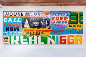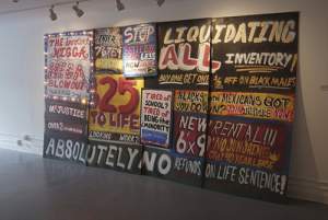 Beyond the beauty of visible mark making in hand-painted signage and pre-computer-generated advertising, my work is strongly influenced by a transdisciplinary look at techniques used to translate ideas by way of color, scale, and composition. My current works are often a satire on personal experience, pop culture, and historical subject matter as I continue to dissect the makeup of my identity.”