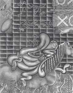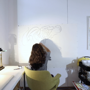 My entryway into each new piece is through focusing on the lines and negative space the figure(s) create. This intuitive process allows me to ask questions about the main narrative bit-by-bit: what gestures are the figures invoking, what’s the tone of the setting, what are the objects and atmosphere suggesting. I play with the balance between the calligraphic style of the figurative elements and the detail of the surrounding scene.”