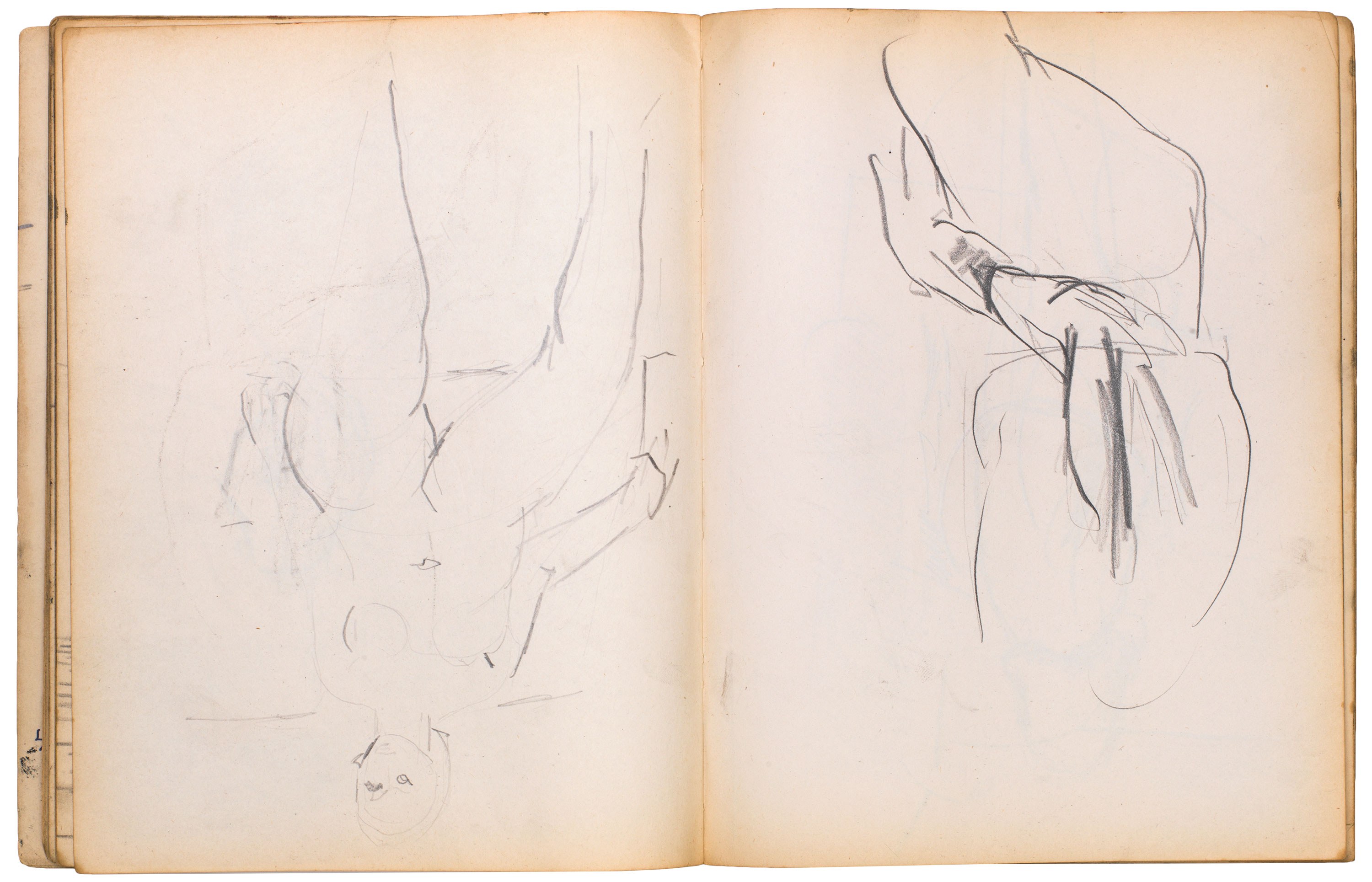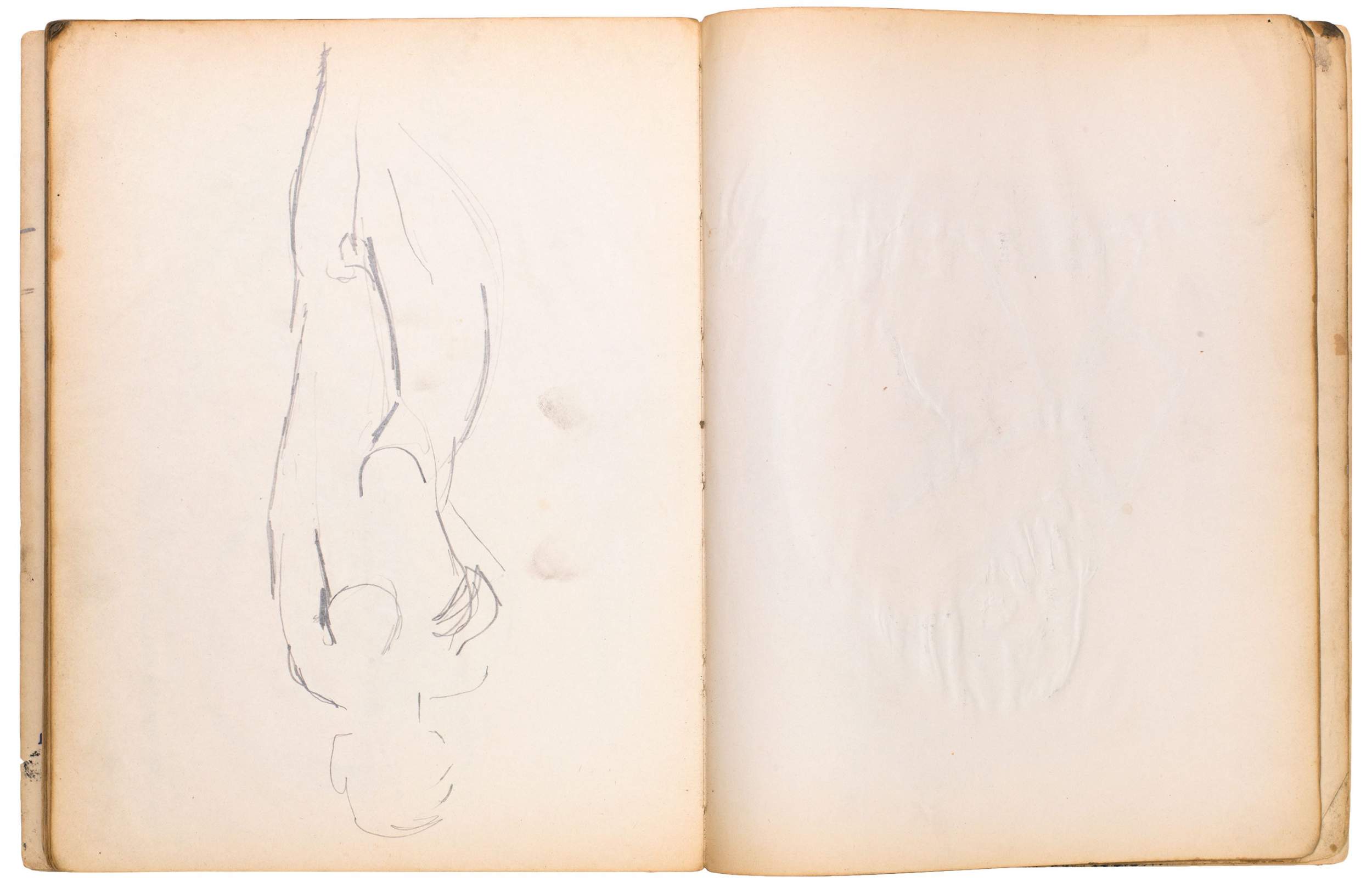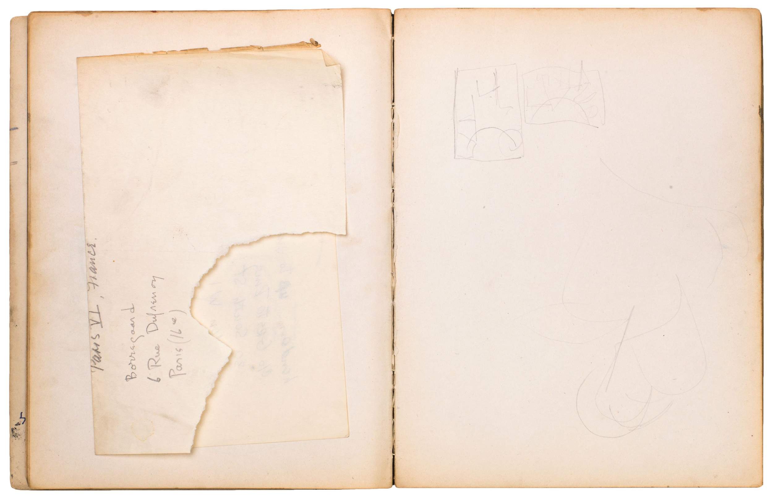 In this sketchbook, Mitchell appeared to work from both the front and back of the book and illustrations often reverse orientation. All pages above appear in the order and orientation they appear in the sketchbook from front to back. Additionally, this sketchbook previously contained loose insertions, which are now housed separately. Images show page spreads with insertions and after their removal, so some page spreads are represented twice.