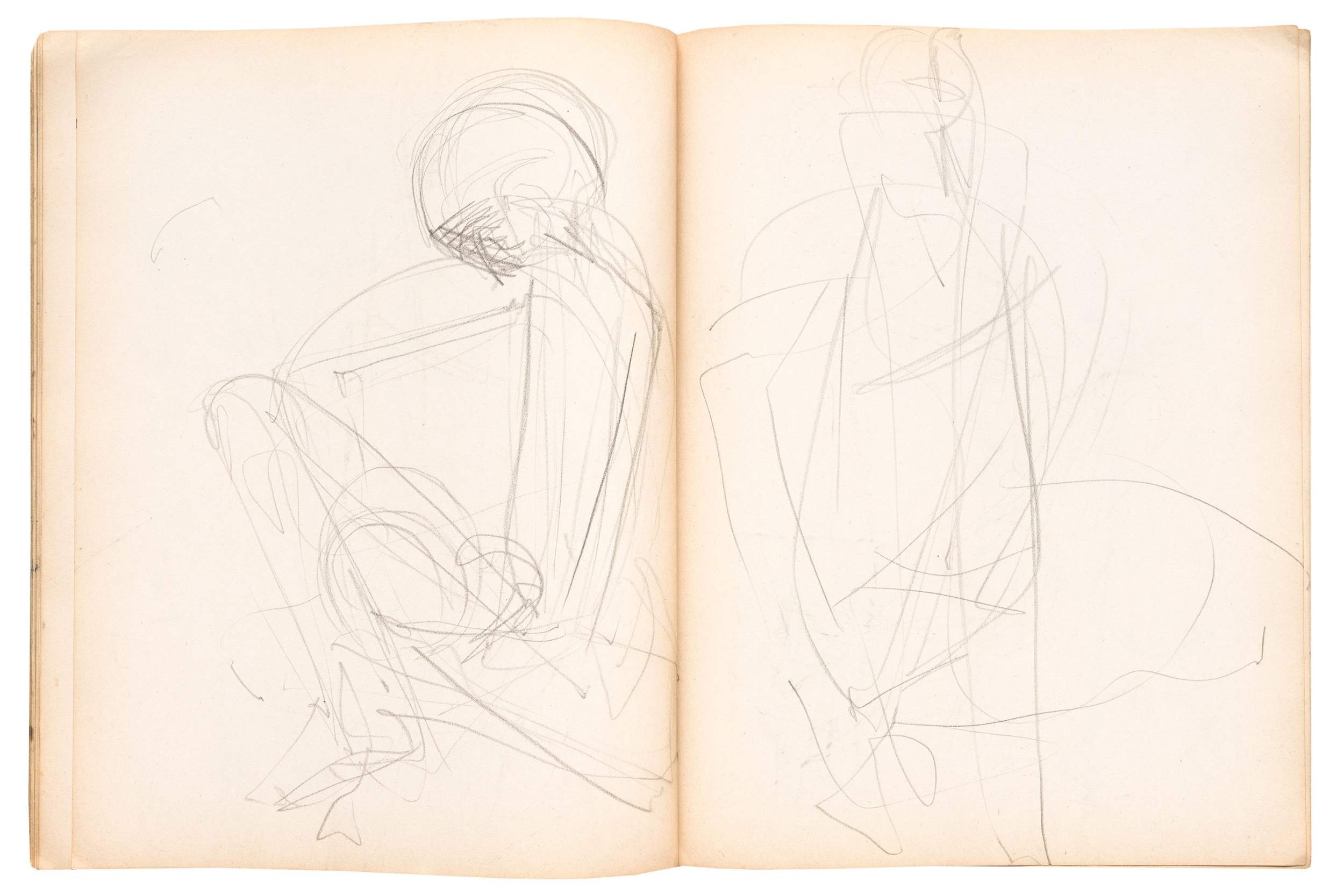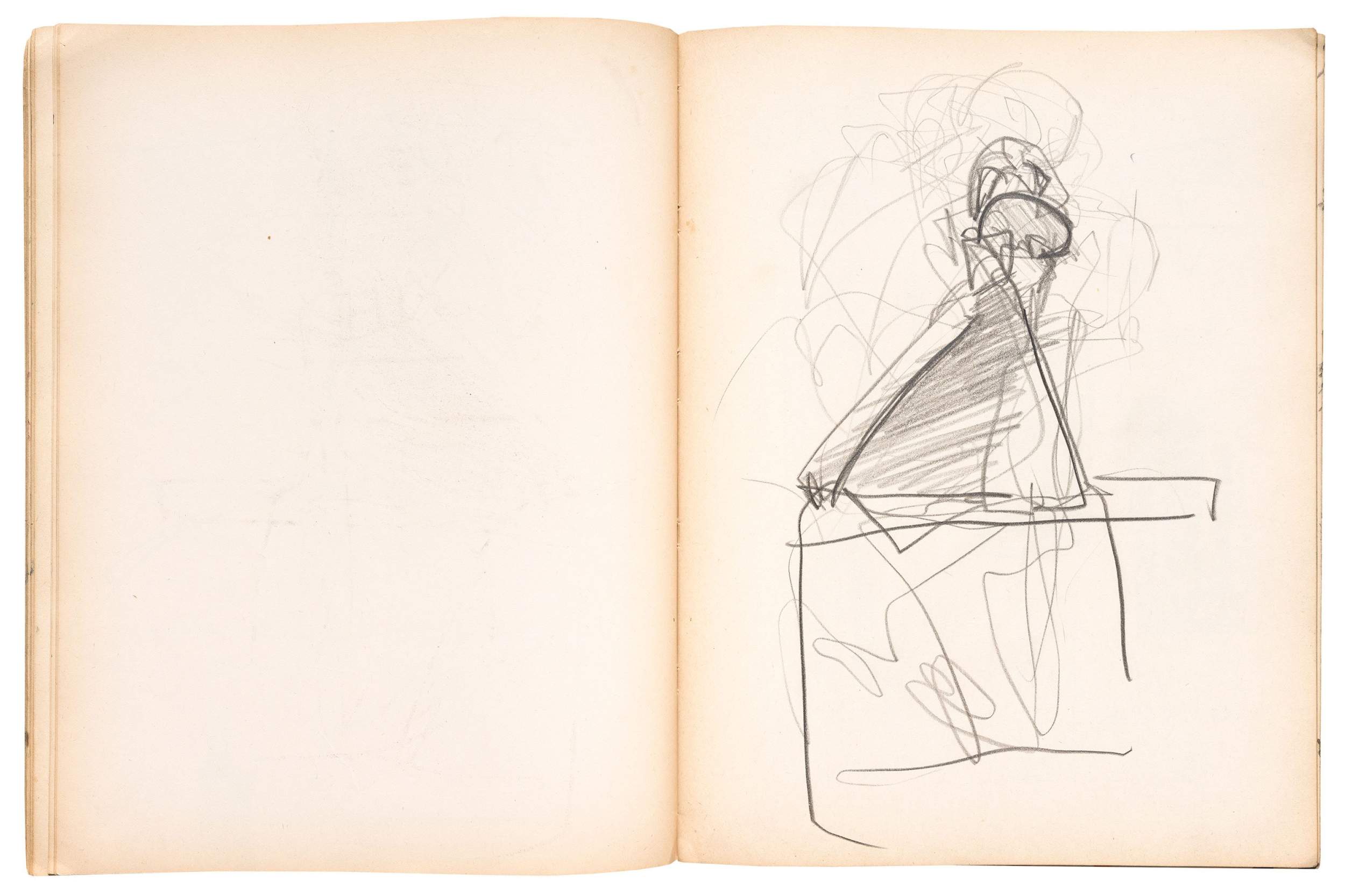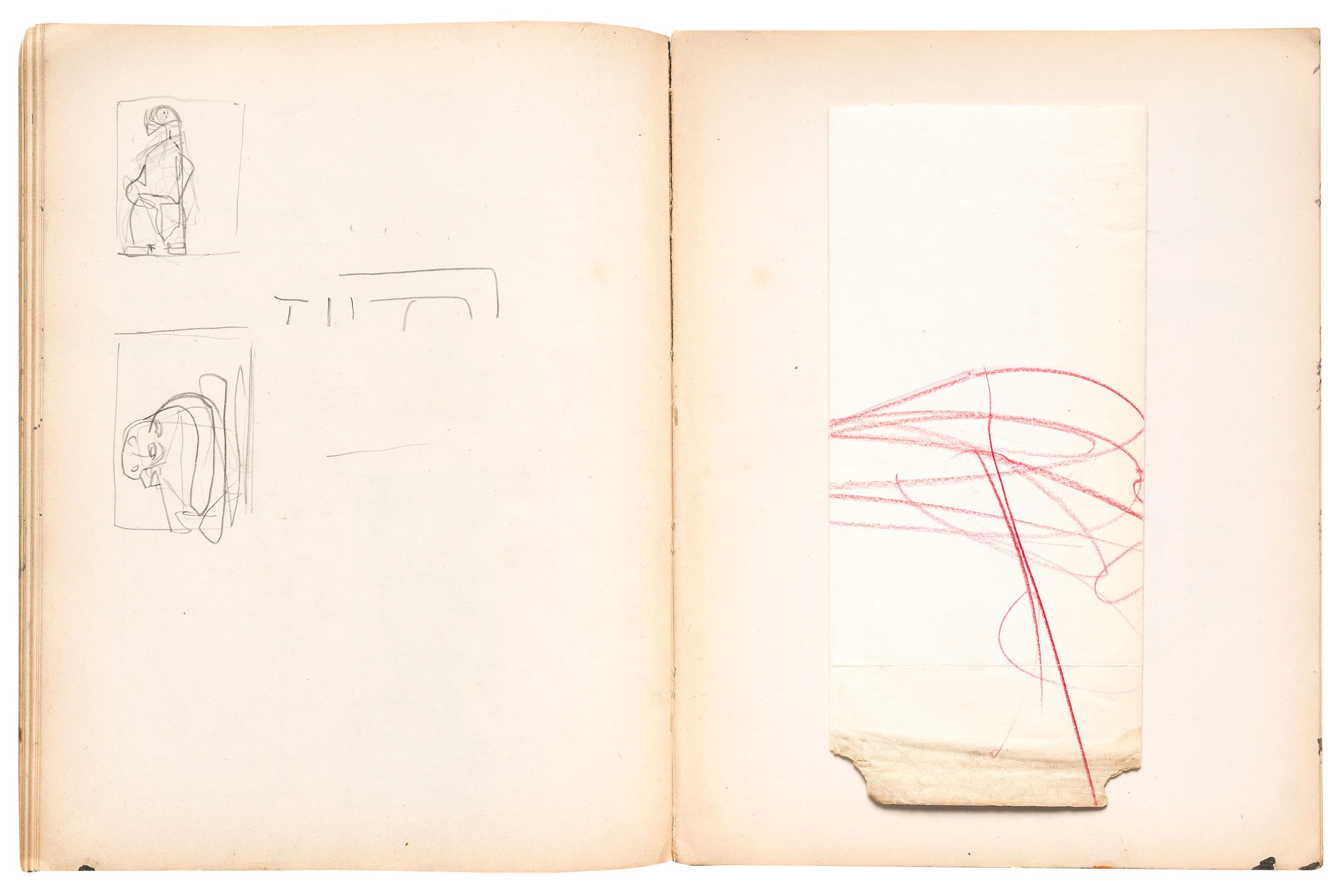Wax crayon, fabricated graphite pencil, graphite pencil, pen and ink, brush and ink, opaque watercolor, and fiber-tipped pen on paper, 90 pages