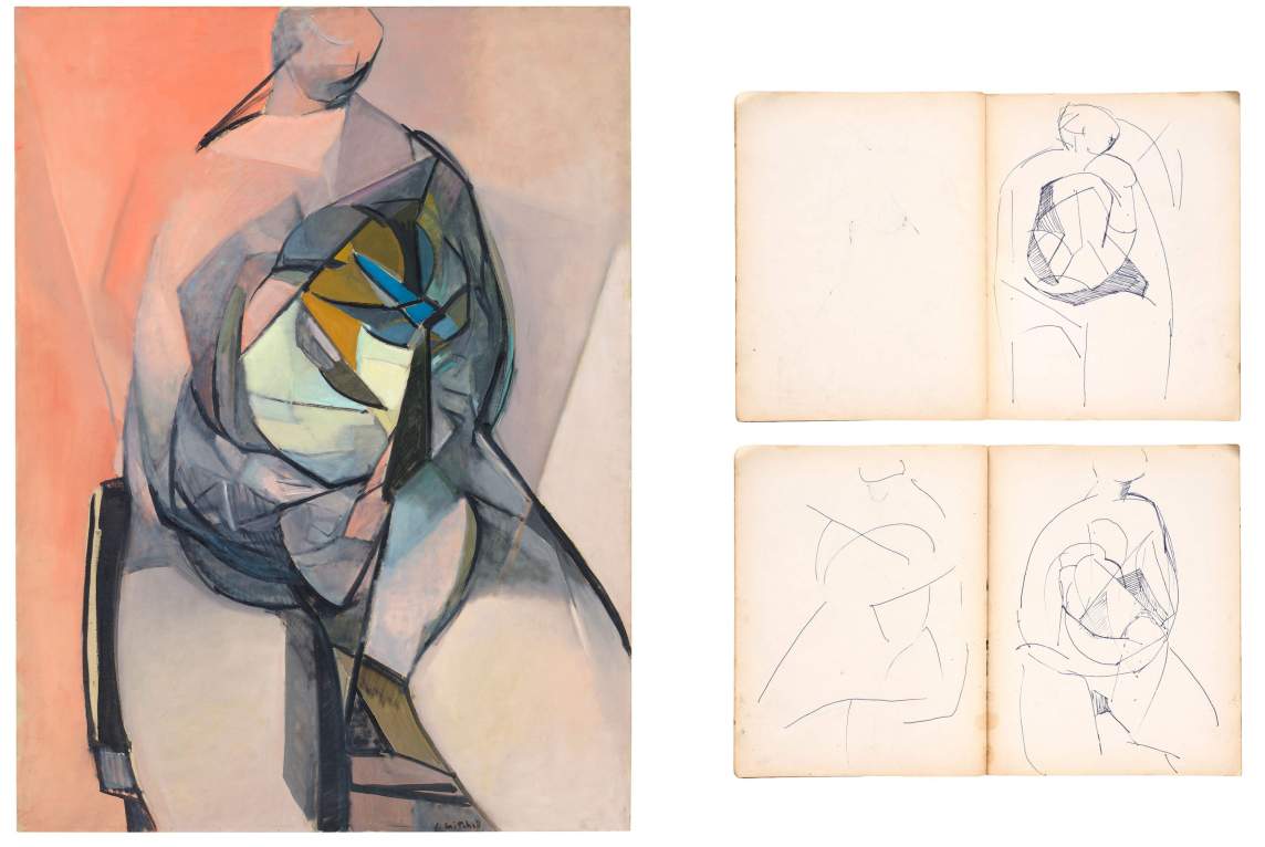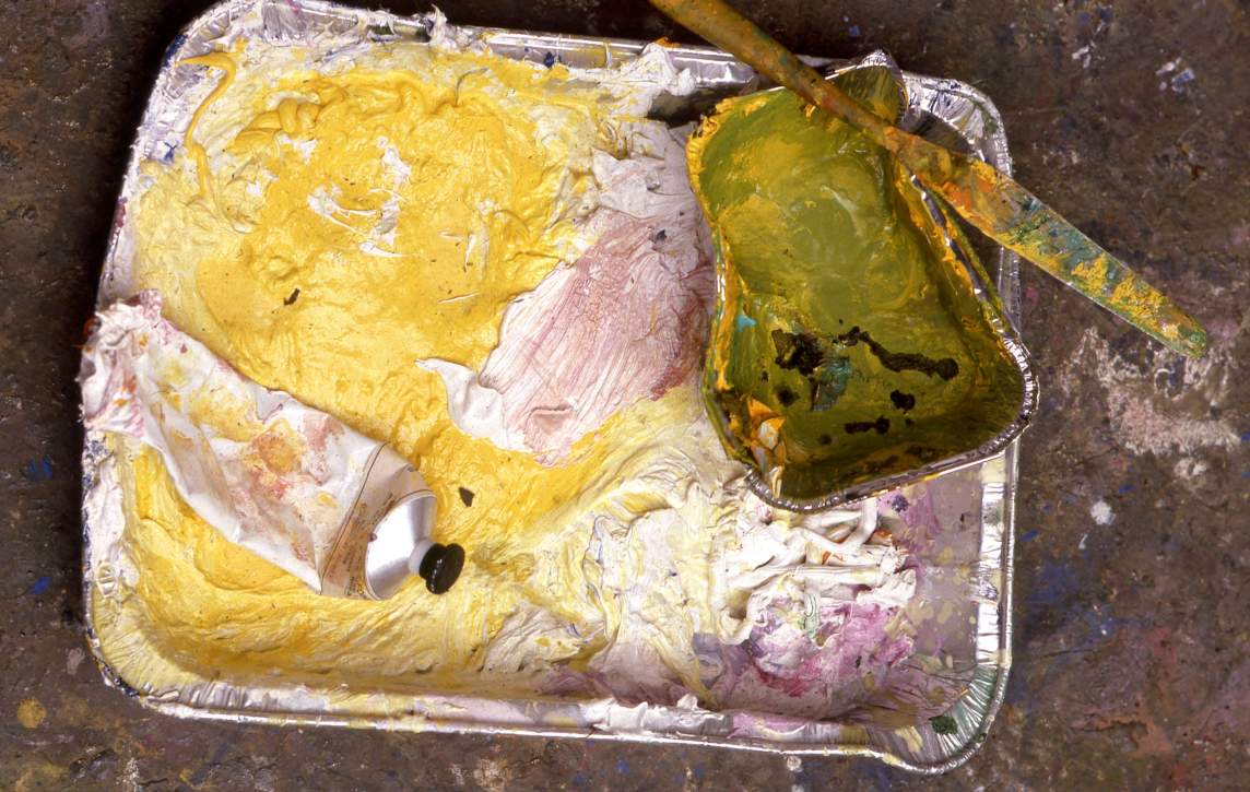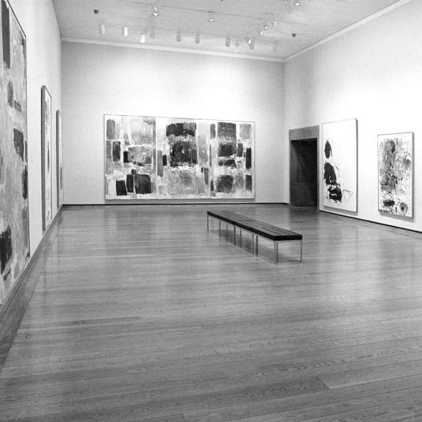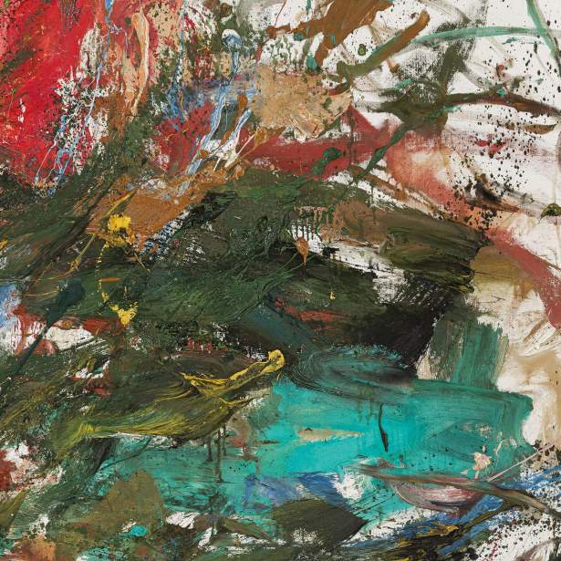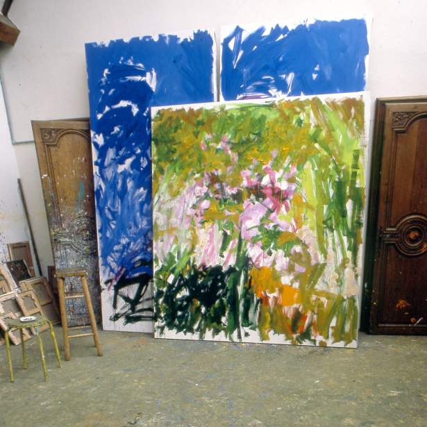 Mitchell’s distinctive use of multiple, joined canvases to create a large-scale, horizontal work began in earnest in the 1960s, and she continued investigating this approach through the end of her life. Mitchell stated that she liked the multipanel format for practical reasons—it allowed her to construct much larger finished works from smaller, easier to handle units— and because she liked the visual effect of the vertical line separating the panels. In some instances, panels act as variations on a motif, as in the two panels of South, 1989; while others introduce a back-and-forth dialogue, much like pages of a book, as in La Grande Vallée IX, 1989. Some, including Salut Tom, 1979, suggest a panorama or enveloping environment, or even, as in La Vie en rose, a series of thoughts or narrative progression across the surface of the work. She also created much smaller scaled single and multipanel works, moving fluidly and effectively from the intimate to the monumental. In all the multipanel works, Mitchell masterfully connects the segments through her orchestration of color choices, the thickness and translucency of her paint, and the proportionate use and placement of different hues, creating movement, light, and space across the full expanse of every work.