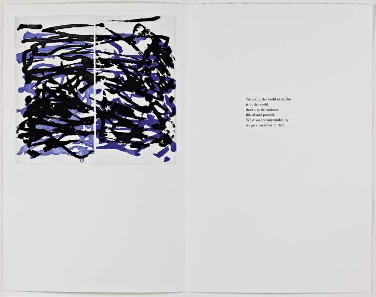 First up is a spread from the artist's book Smoke, a collaboration between Mitchell and the poet Charles (Hank) Hine. Printed and published in 1989 by Limestone Press in San Francisco, this unbound portfolio contains sixteen aquatint etchings by Mitchell alongside poems by Hine, including the folio depicted here. The text reads: "We are in the world as smoke / is in the world / drawn to its contours / fitted and pressed. / What we are surrounded by / we give ourselves to that."