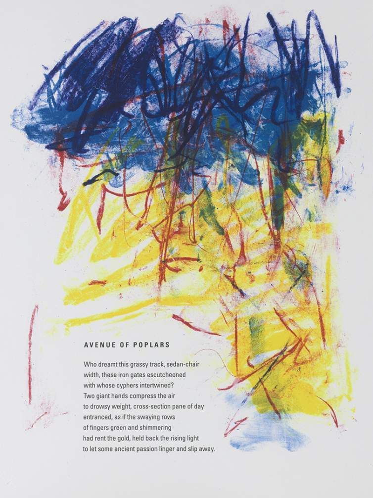 The text reads: “AVENUE OF POPLARS / Who dreamt this grassy track, sedan-chair / width, these iron gates escutcheoned / with whose cyphers intertwined? / Two giant hands compress the air / to drowsy weight, cross-section pane of day / entranced, as if the swaying rows / of fingers green and shimmering / had rent the gold, held back the rising light / to let some ancient passion linger and slip away.”