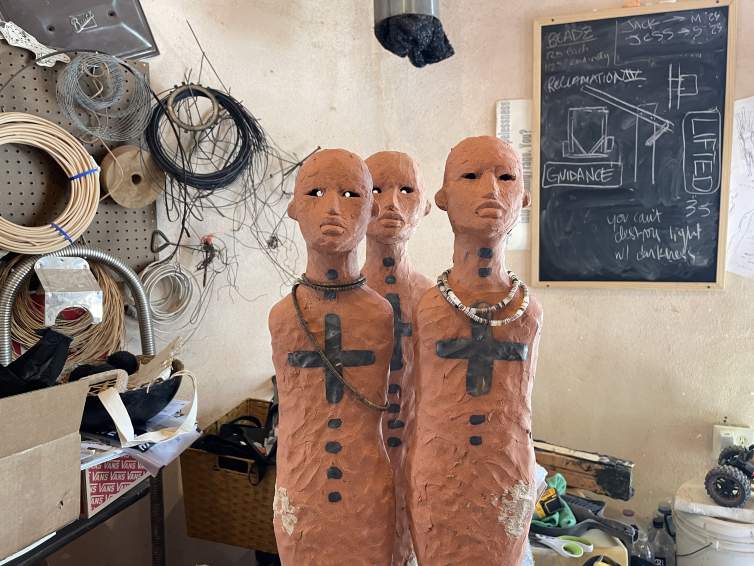 I am about to go to Williamstown, Massachusetts, to install 12 nine-foot-tall figures at a place called Field Farm. I made the originals in wood and they have been cast with colored cement, which is the first time in my life I have collaborated or had someone else sort of reproduce my work. It was a whole other way of working where my hand isn't necessarily in it because I carved the figures with a chainsaw, so they're different from my clay beings. We’re going to go install all 12 of these in the field. In that specific location is the Stockbridge-Munsee Band of Mohicans that have been relocated to Wisconsin, and we're going to be sourcing local clay from the area and then taking it to their community and we'll be making beads for the sculptures, so they’ll have these handmade bead necklaces.