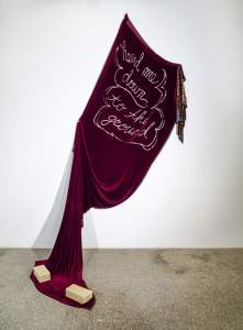 I make sculptures, prints, installations, and performances that transform materials. I’m interested in how we soothe, protect, fashion, and enhance ourselves. I freestyle with mass-produced products like sneaker rubber, beauty products, backscratchers, and crackpipes, combined with artist-produced objects made from materials such as clay and velvet—telling stories, making dedications, erecting structures, and leaving evidence.”