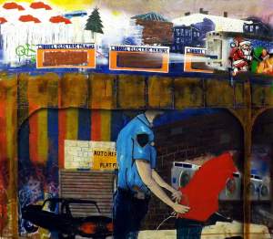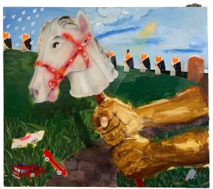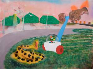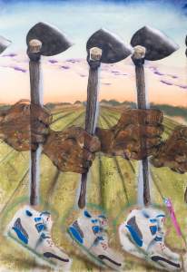My paintings combine personal and historical imagery into surreal juxtapositions, drawing on my experiences living in America to meditate on complex questions of race, class, labor and a militarized culture. Growing up in Louisiana, I found my way to art through painting and photographing boxcars. This entry point has allowed for more diverse mediums, painting and mark-making approaches when creating images.”